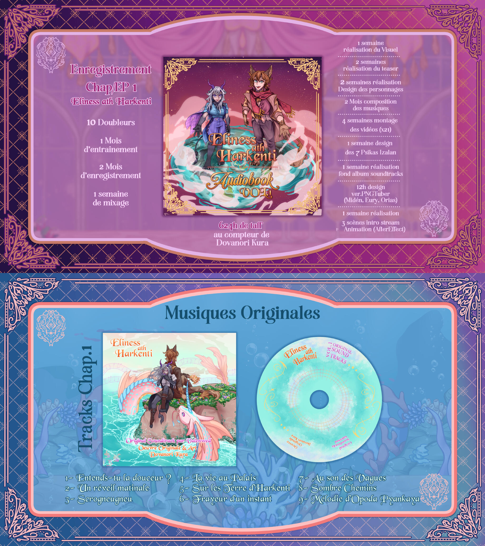 Il aura fallut 3 mois de détermination, organisation et productivité pour préparer ce dernier.Pour ses débuts, Dovanori Kura entame son aventure en douceur avec l'Audiobook, sur lequel elle travaille avec une équipe de débutant / amateur dans le domaine du doublage en temps qu'hobbie. Ce dernier à pour but principal de se faire plaisir, et donner vie à "Eliness ath Harkenti" tout en offrant l'opportunité de commencer dans le doublage. Mais elle travaille également avec un compositeur afin de créer des musiques officielles pour le projet globale, ne se limitant pas à l'Audiobook.L'audiobook n'a aucune monétisation, son seul intérêt est de partager l'univers d'Harkenti de manière accessible sans contre-partie auprès du publique. Mais cela ne vaut que pour l'audiobook en lui-même.